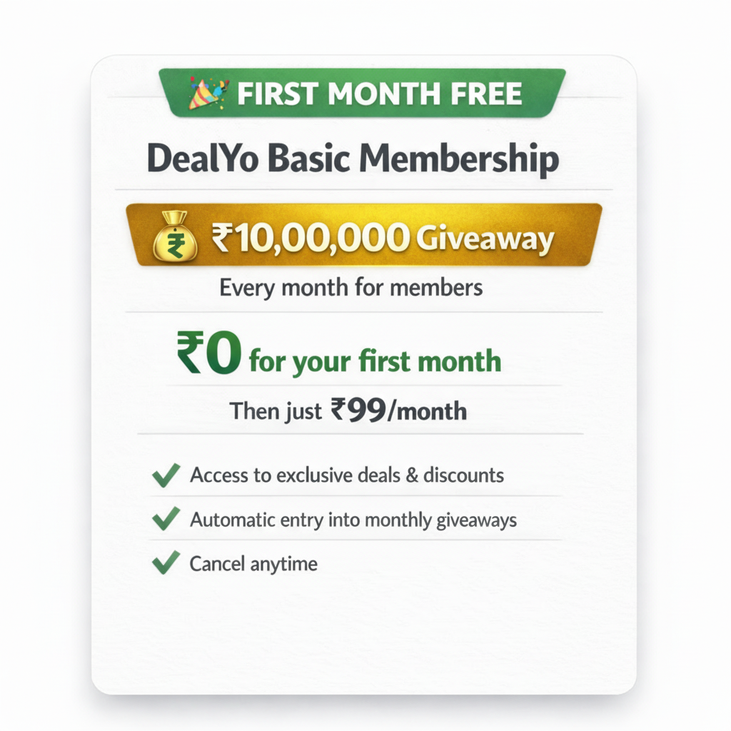 DealYo की बेसिक मेंबरशिप आपको विशेष छूटों के साथ-साथ हमारे मासिक सम्मेलन में भाग लेने का अवसर भी प्रदान करती है। ₹18,00,000 का इनाम